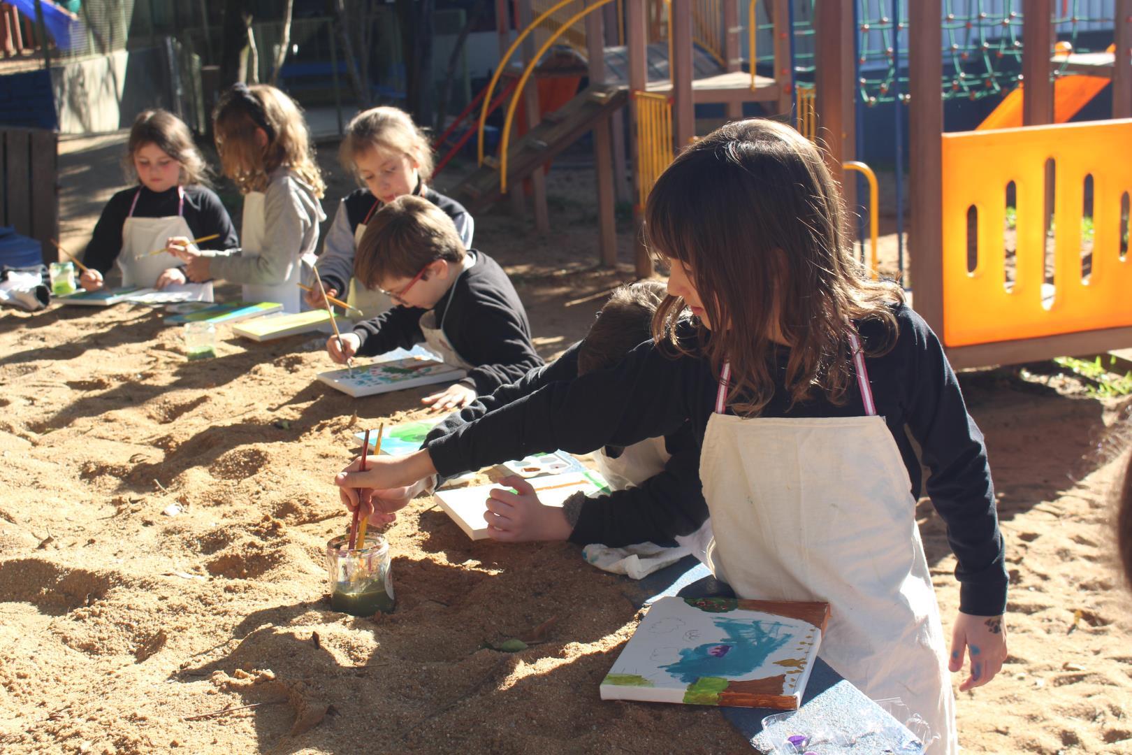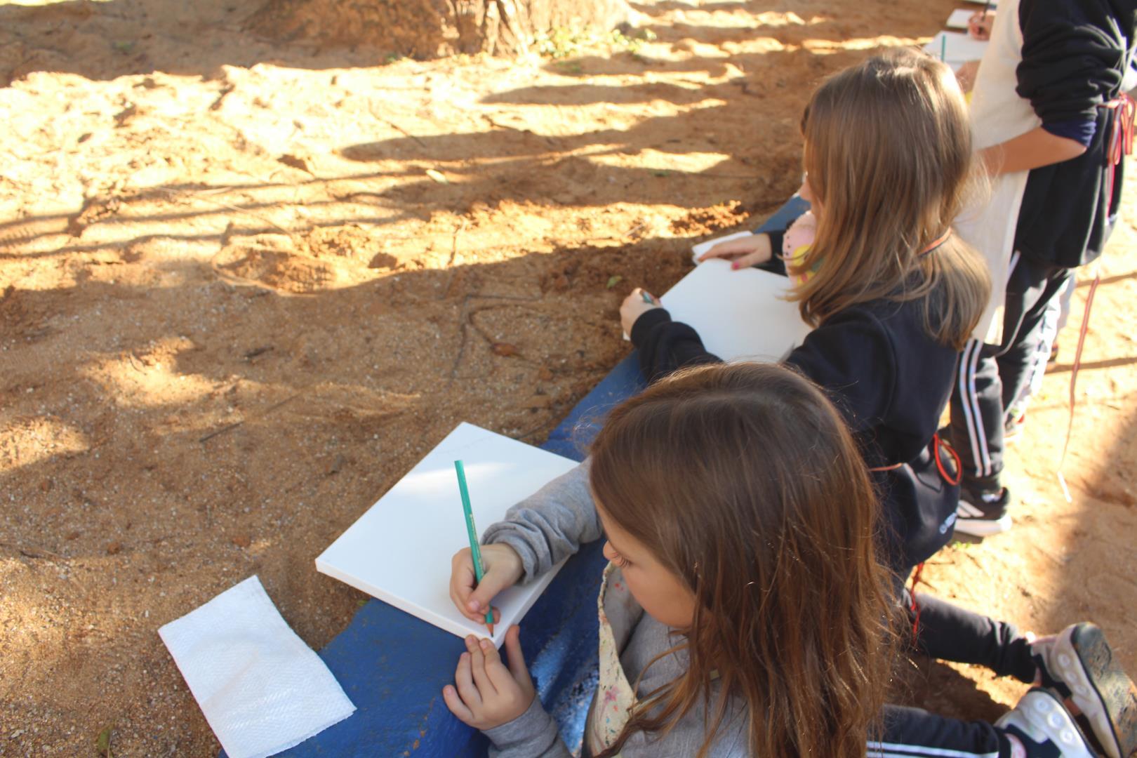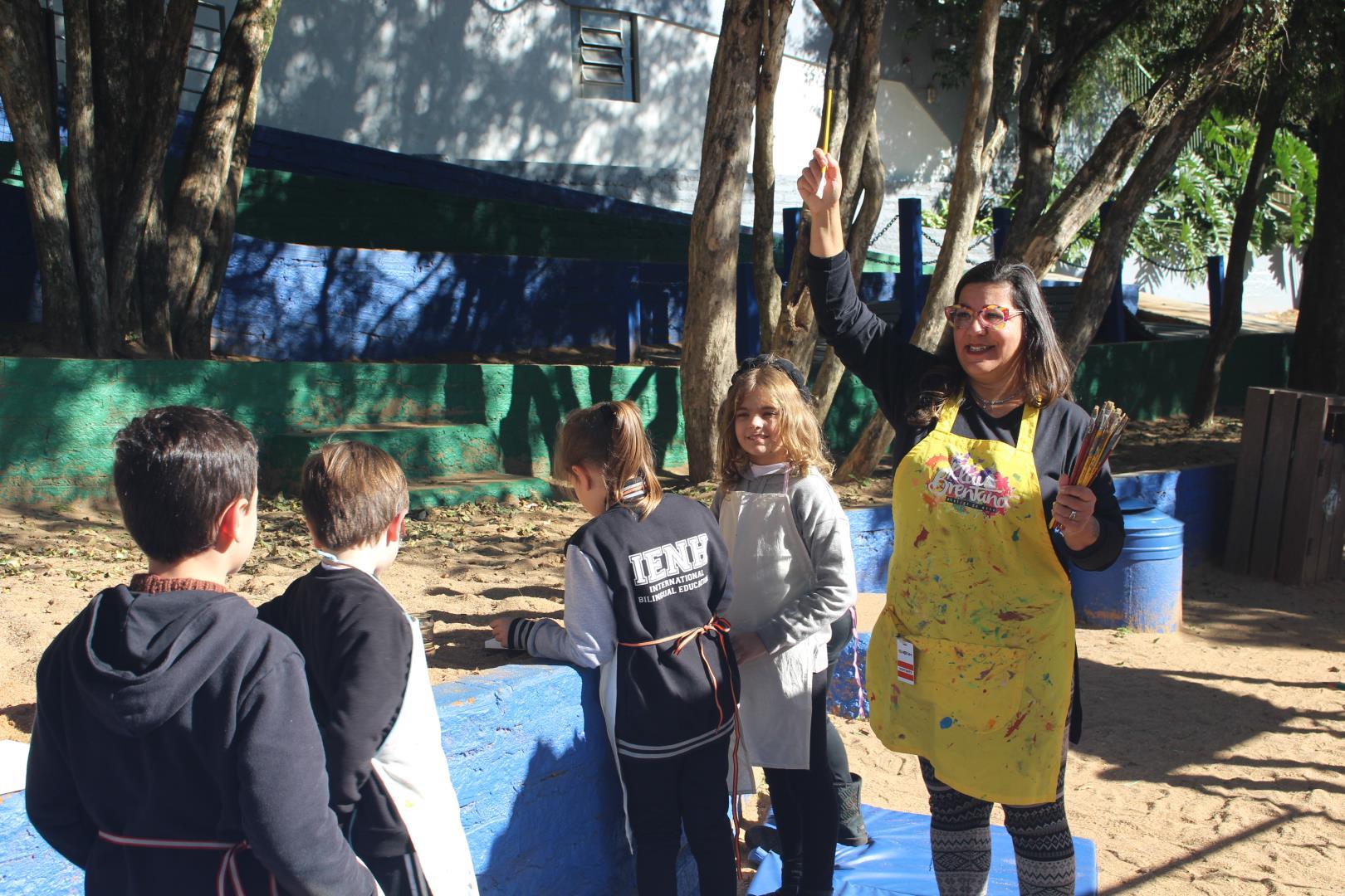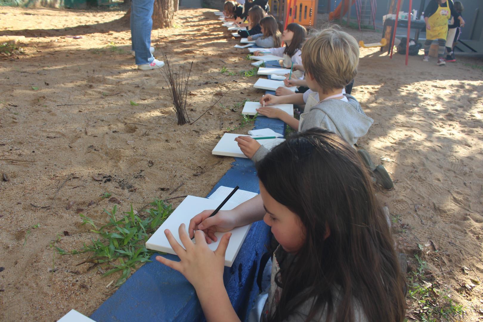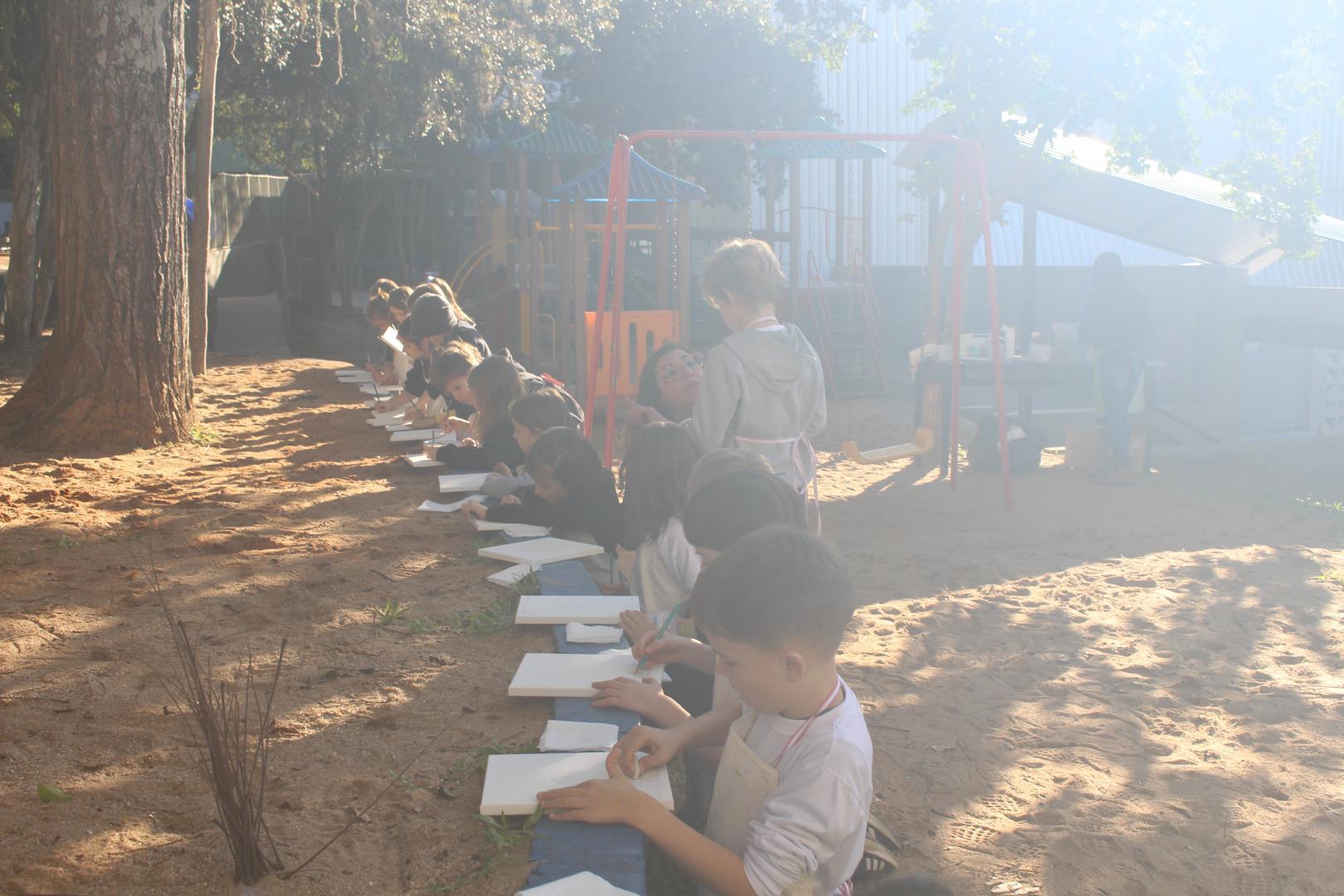 A atividade aconteceu ao ar livre, no pátio Florestinha, onde o ambiente natural se misturou ao processo criativo. “Foi um momento de liberdade artística em contato com a natureza”, destacou a professora Daiane.