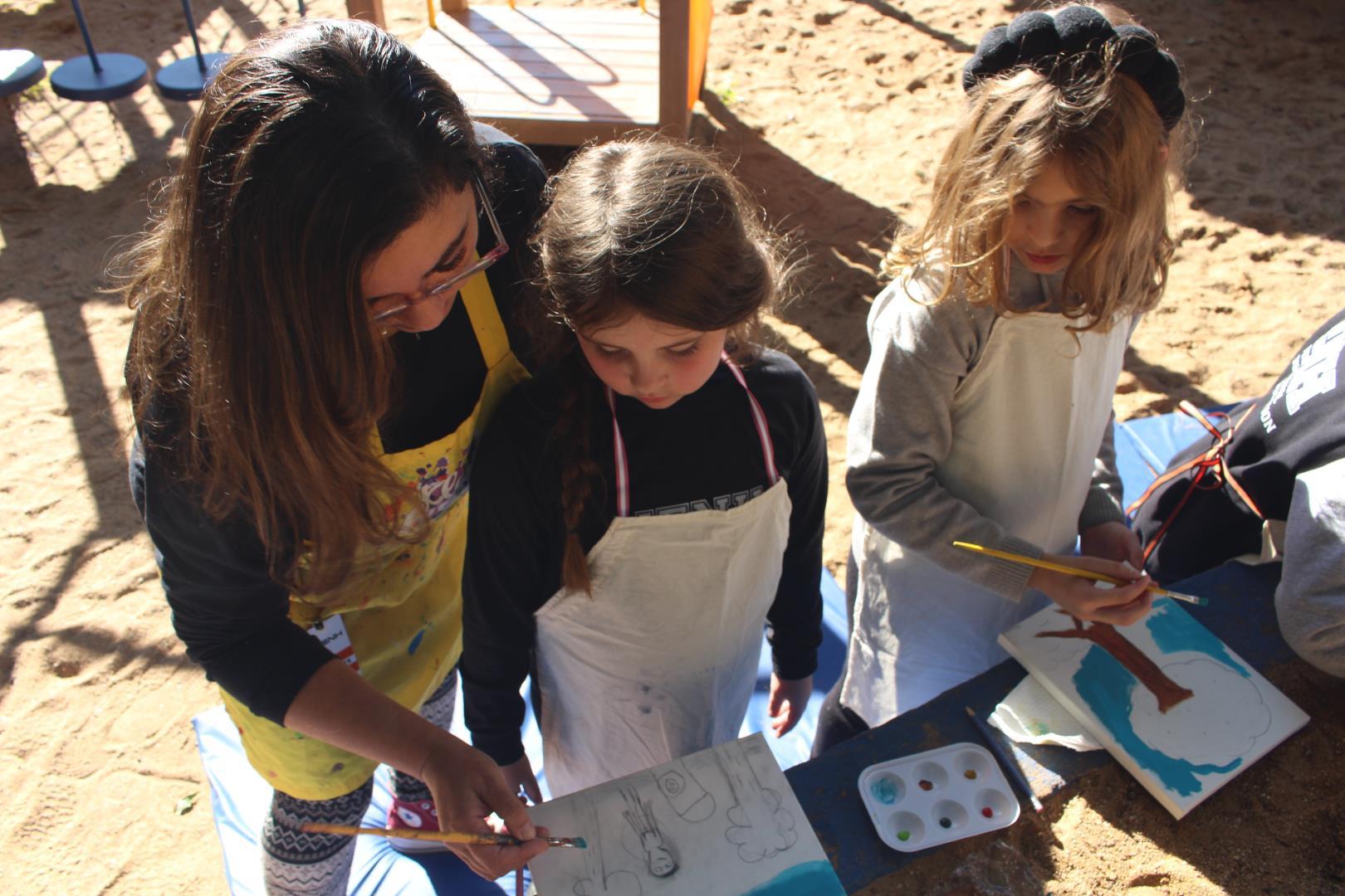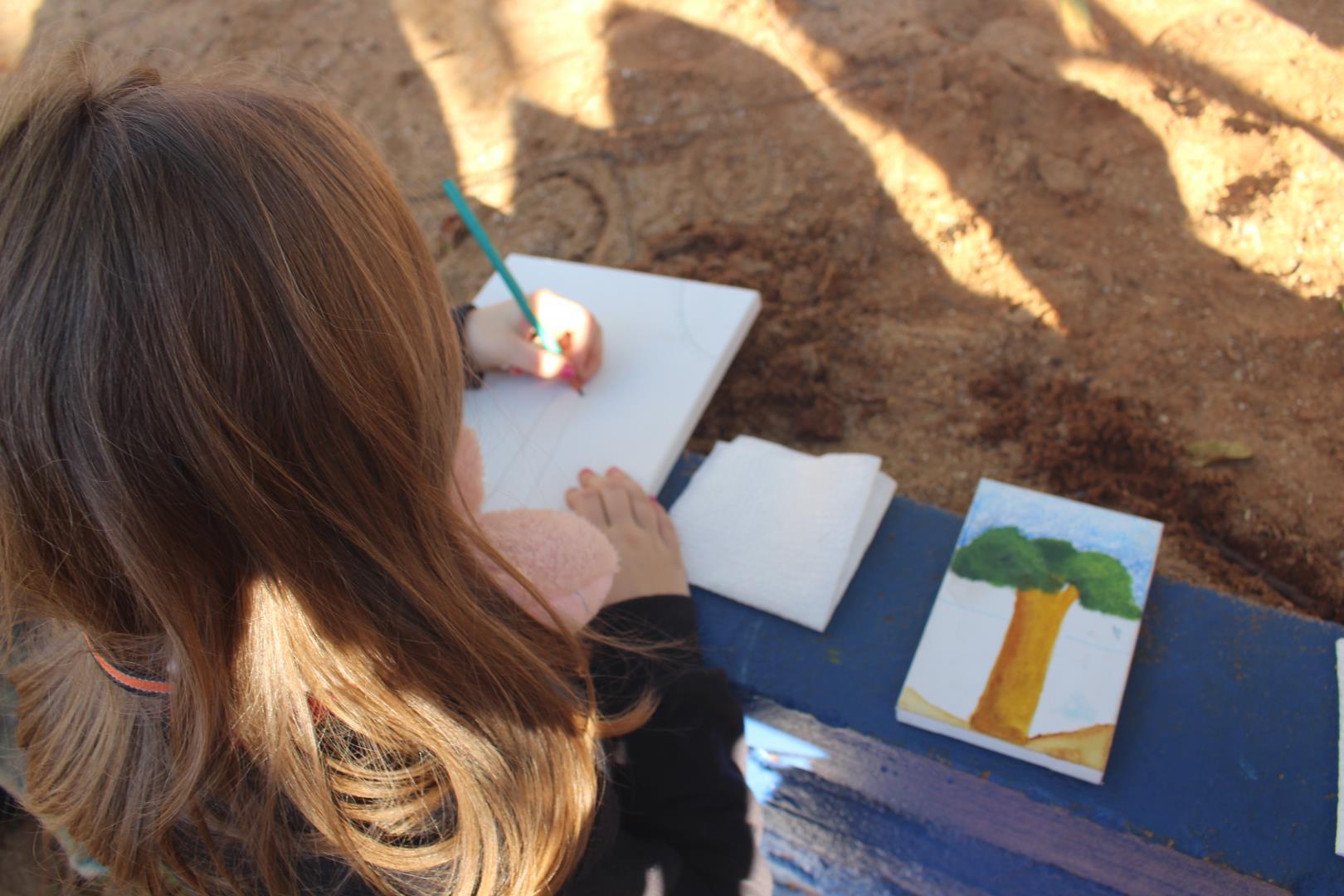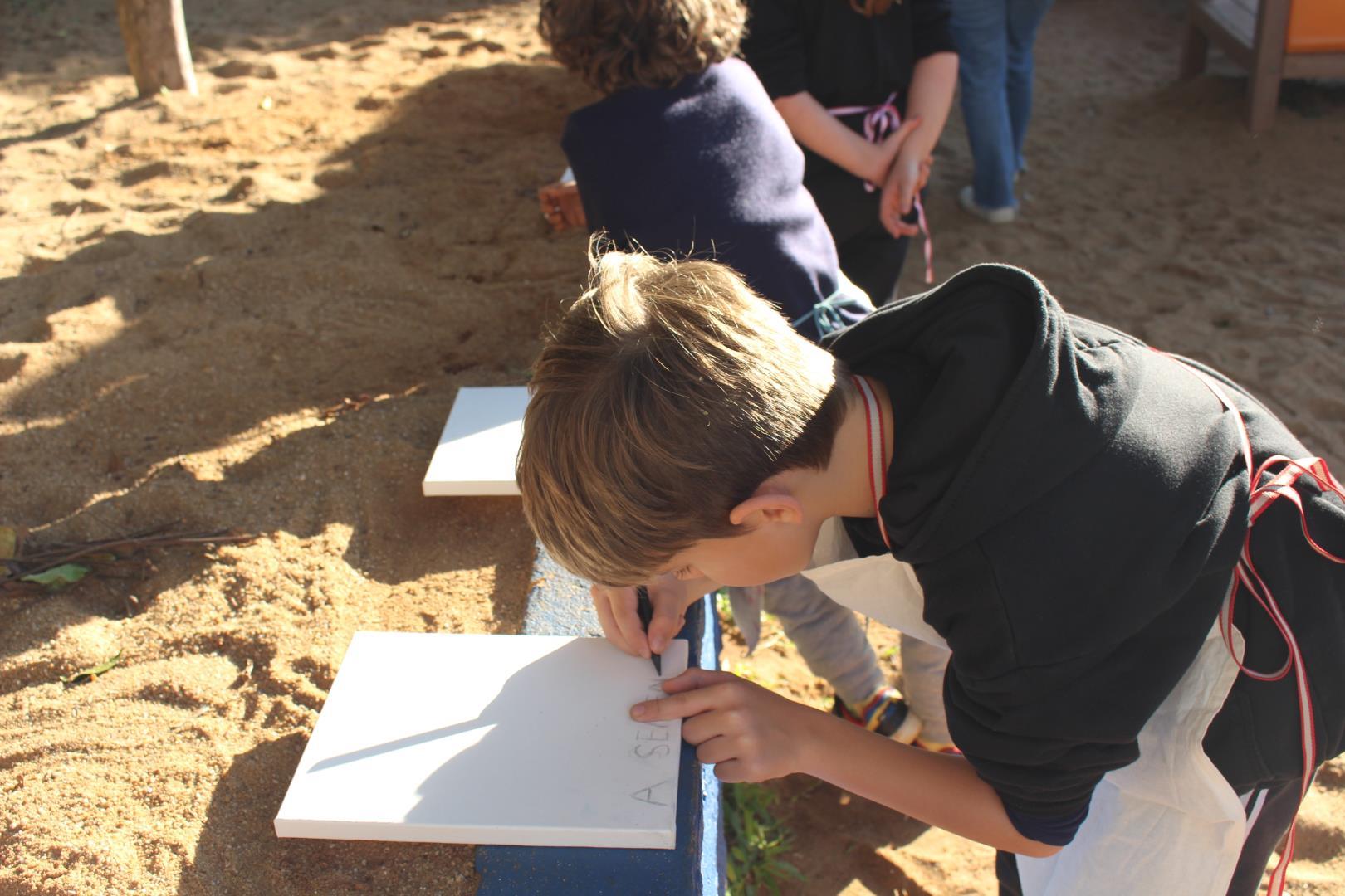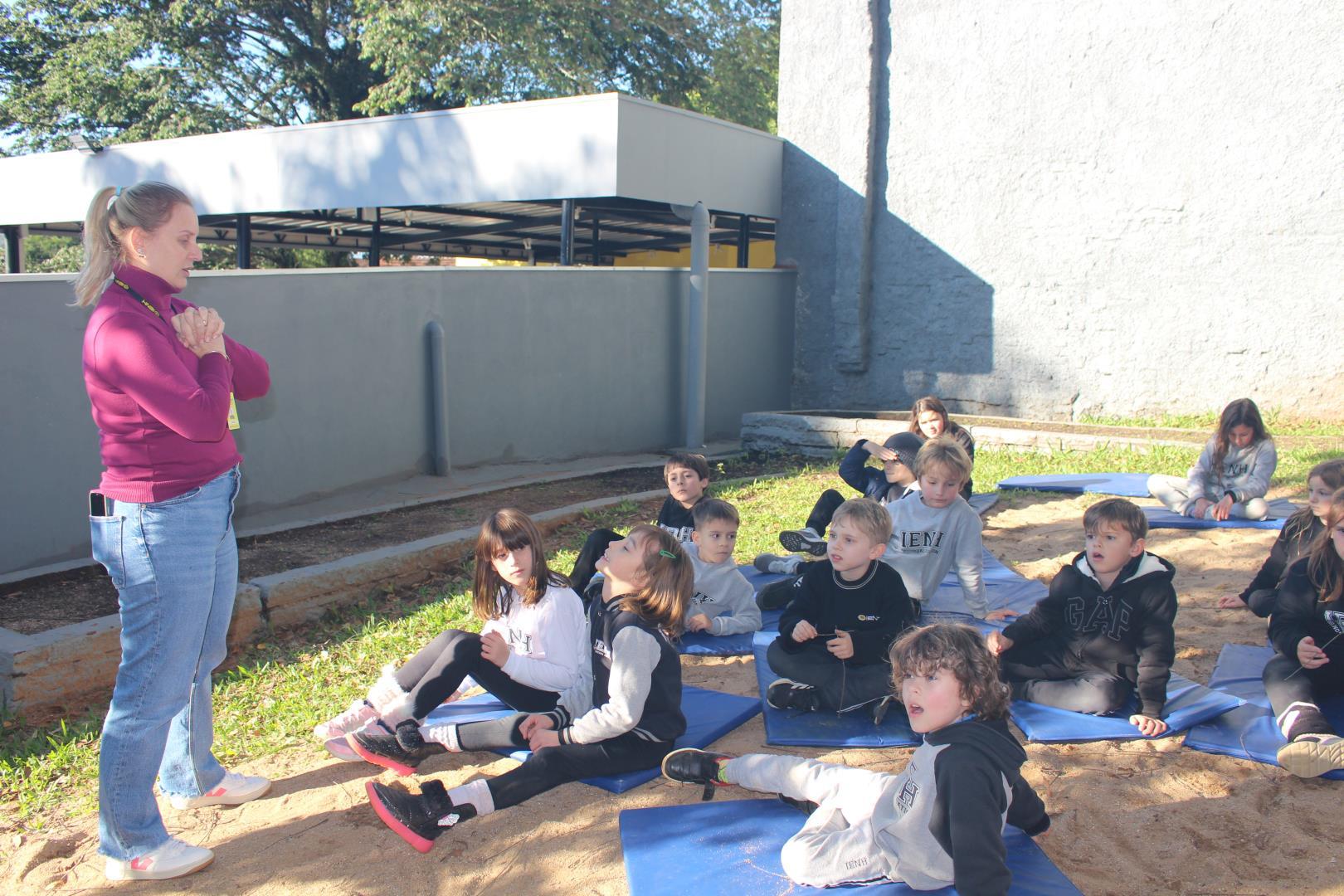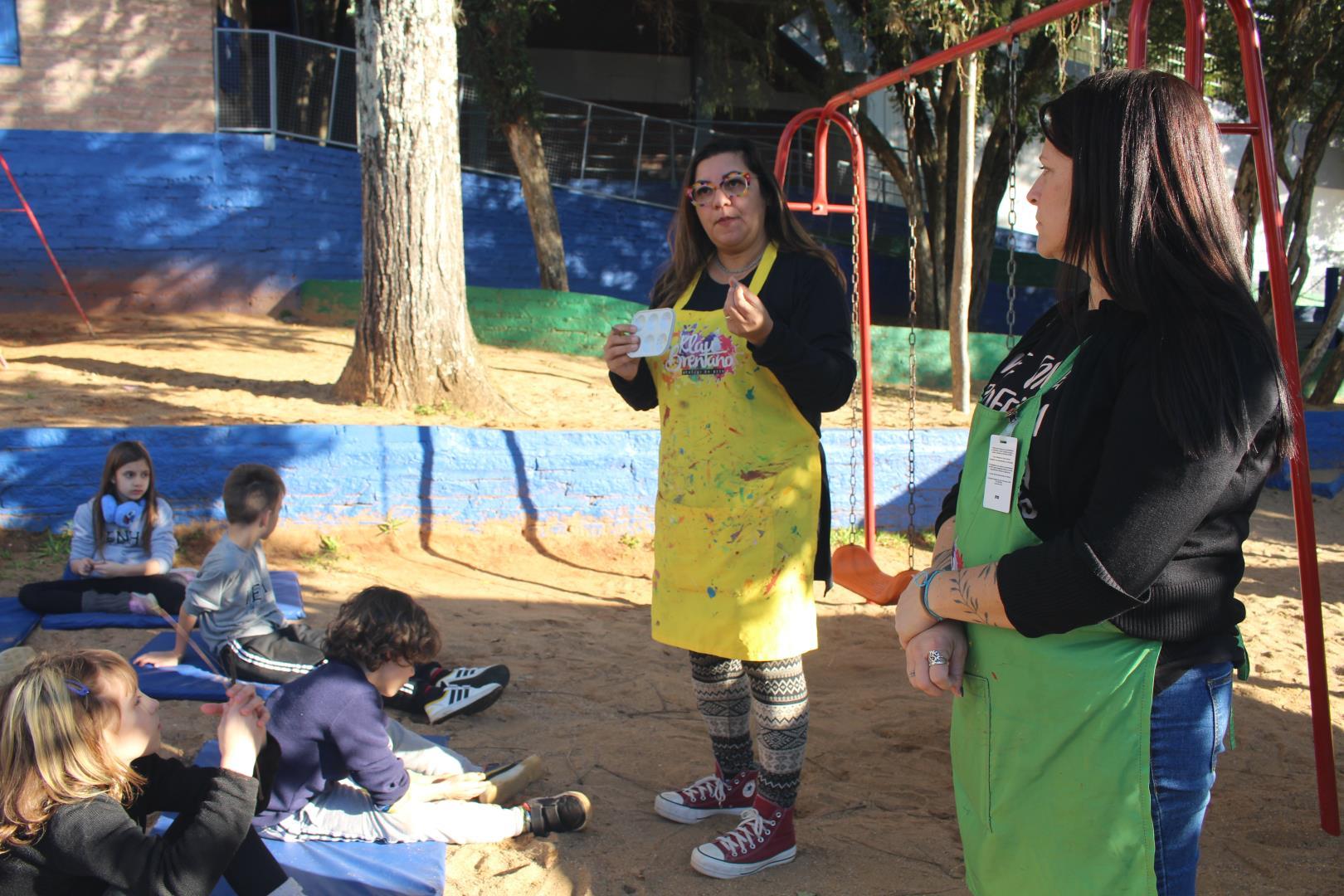 A atividade aconteceu ao ar livre, no pátio Florestinha, onde o ambiente natural se misturou ao processo criativo. “Foi um momento de liberdade artística em contato com a natureza”, destacou a professora Daiane.
