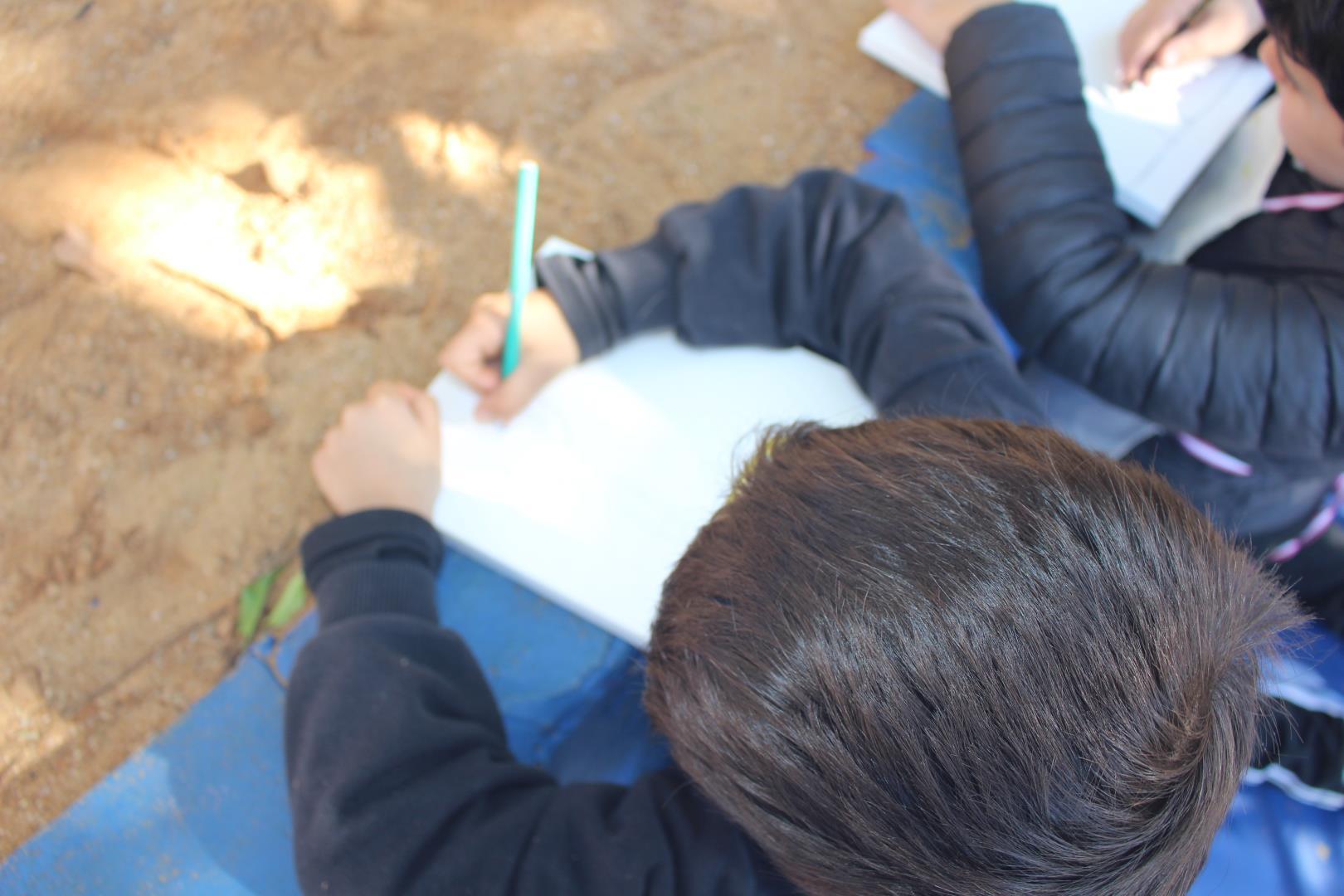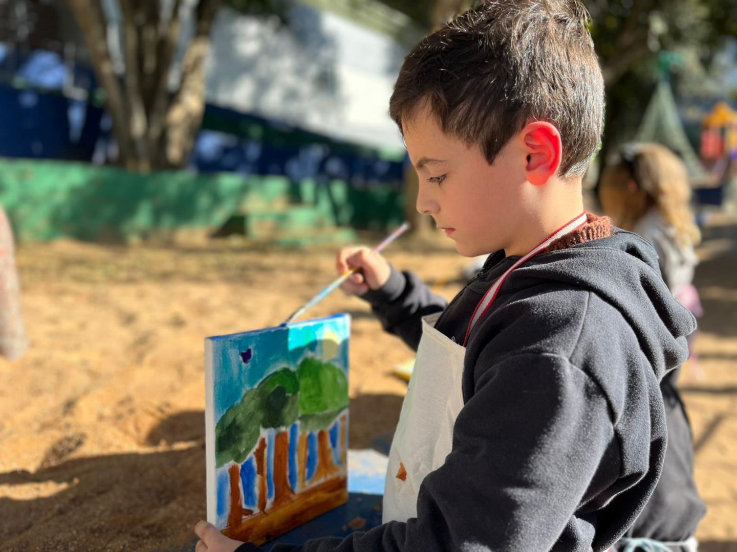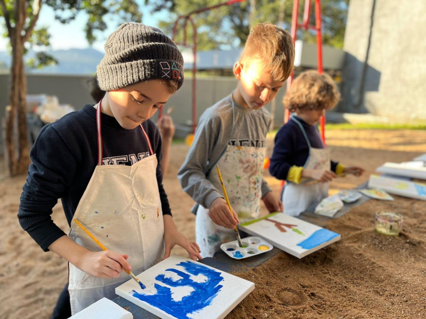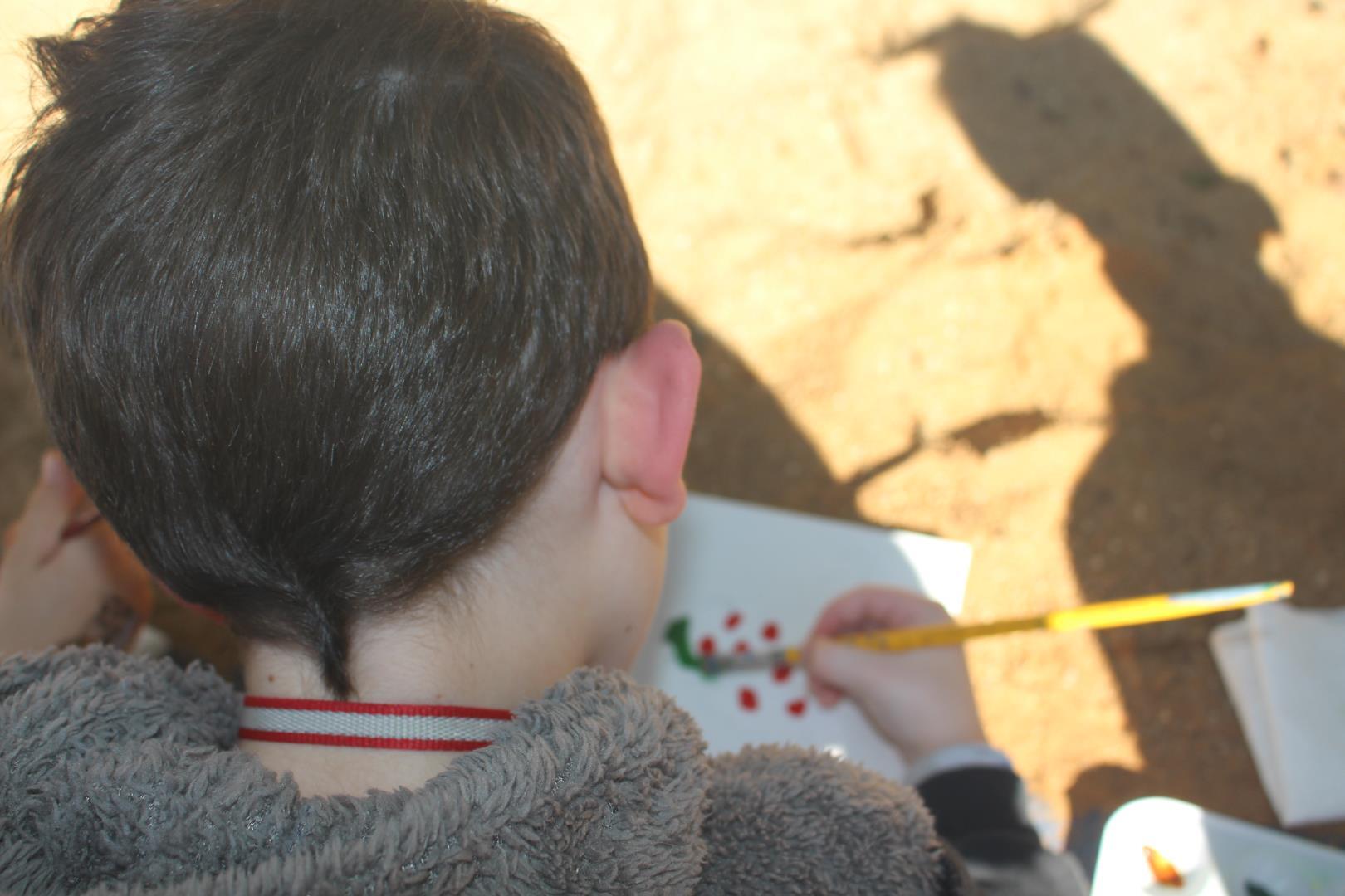 A atividade aconteceu ao ar livre, no pátio Florestinha, onde o ambiente natural se misturou ao processo criativo. “Foi um momento de liberdade artística em contato com a natureza”, destacou a professora Daiane.