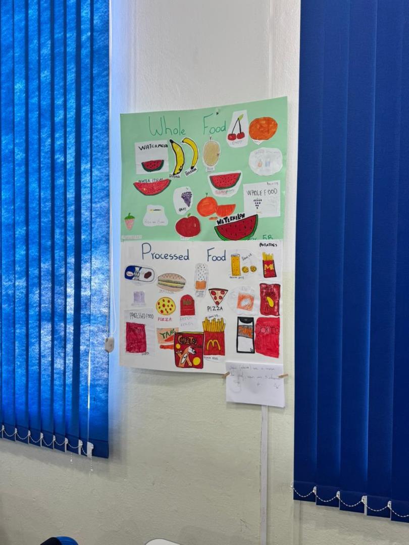 Finalizando o projeto, as turmas produziram coletivamente pôsteres ilustrativos com exemplos de alimentos naturais e processados, que foram apresentados na feira de projetos escolares.